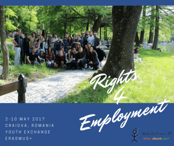 The Erasmus+ Project “Rights 4 Employment” will take place in Craiova since 2nd of May until 10th of May. Asociația Tinerii 3D is the hosting organization. The youth exchange is organized as a Erasmus+ Project.